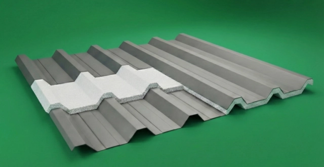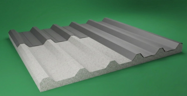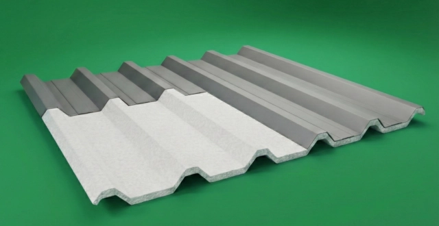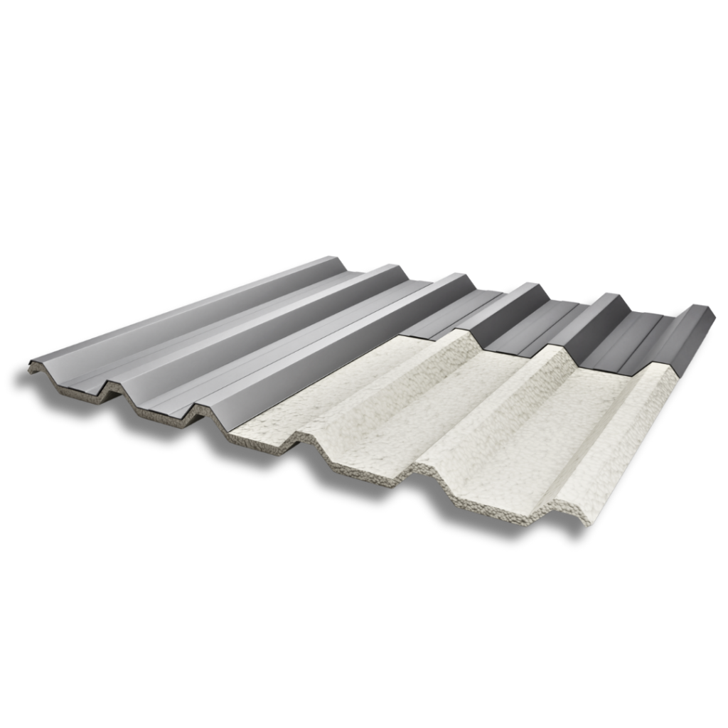 Telha completa com EPS entre duas chapas metálicas. Máximo isolamento térmico e acústico.